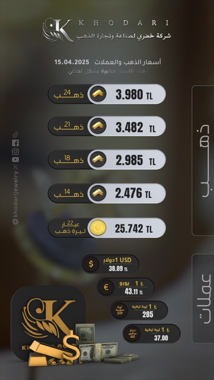 سعر غرام الذهب يوم الثلاثاء 2025-04-15 - سعر الليرة التركية امام الدولار اليوم